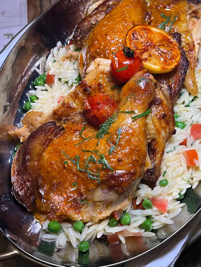 這道烤雞使用三黃雞,皮香肉嫩,十分美味。🍗底部的米型意粉吸滿了雞油,確保每一口都能感受到濃厚的雞肉風味,令人一試成主顧。
