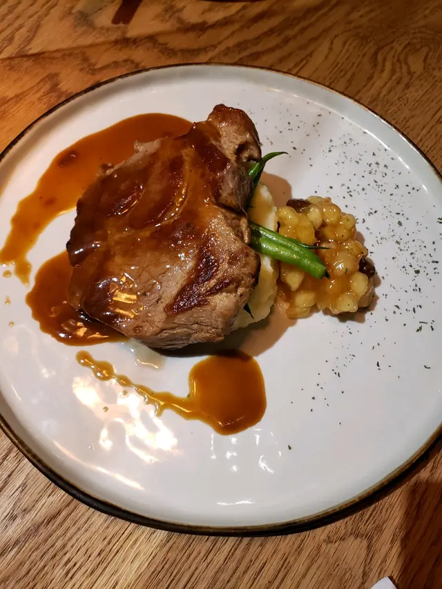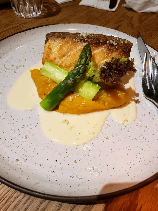 香煎軍曹魚扒🐟🐟、南瓜蓉、白蘆筍、青檸椰青忌簾汁:魚扒肉身夠厚,無任何雪藏味。而佢個南瓜蓉雖然係配菜,但就幾好食噃,有少少喧賓奪主嘅感覺。不過整體都好夾!