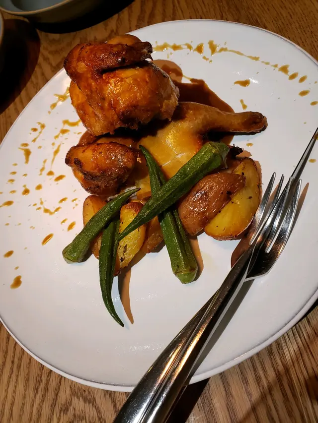 烤美國春雞🐔🐔、烤薯🥔🥔、烤秋葵:本身想叫番個慢煮雞胸,點知佢只係午市先提供,所以就叫左呢個雞代替番。雖然唔係慢煮,但佢個雞肉都好嫩滑噃!無令我失望,goodgood👍👍!