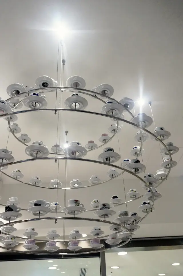 別忘記抬頭欣賞一下由咖啡杯組成的巨型擺設,水晶燈般的造型,一圈又一圈的咖啡杯在燈光的映照下亮白生輝,很有美感。