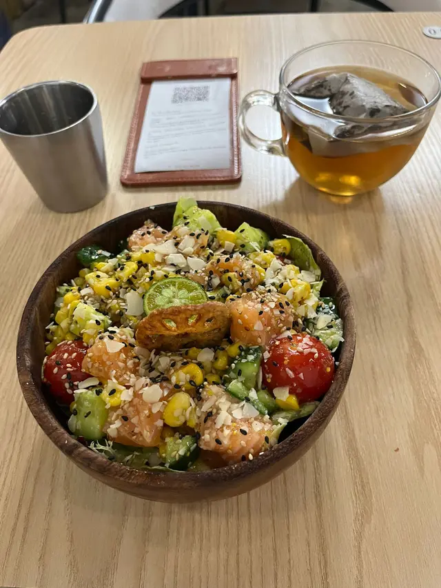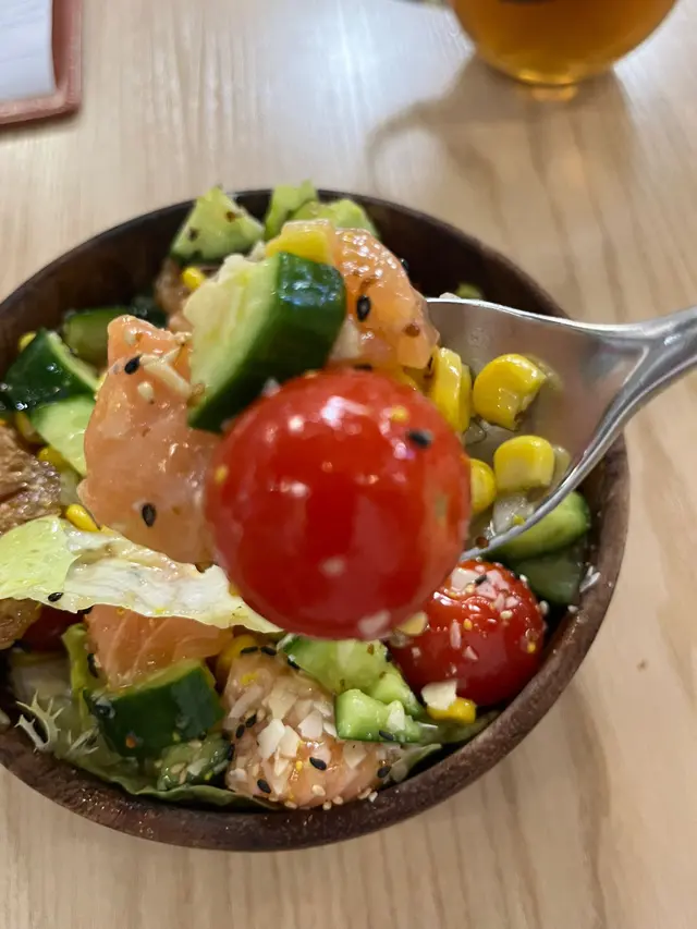 這道沙拉更像一幅立體水彩畫——橘紅魚生、嫩綠蔬菜、金黃芒果在純白陶碗中綻放熱帶風情,隨手一拍即能點亮社交媒體。店內工業風裝潢搭配木系餐桌,讓人在粗獷水泥牆間感受一絲療癒禪意,繁忙中偷閒的儀式感油然而生。