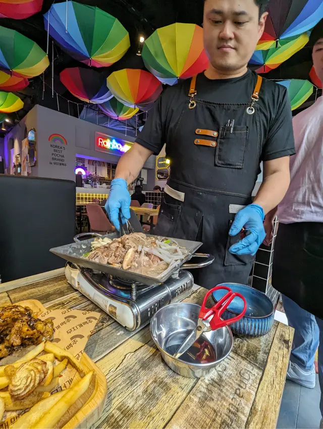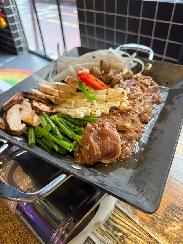 雜菇烤牛肉 - 超大盤牛肉加上寬粉和雜菇放在gas爐上即烤,暖笠笠又熱辣辣,味道不錯,幸運地有細心的oppa 幫手烤和剪肉,懂韓語的可以返兩句