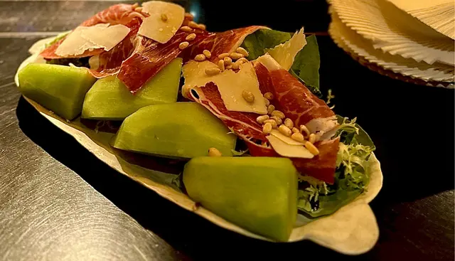 哈密瓜與薄切的帕爾馬火腿相得益彰。搭配烤香的松子,淋上香醇的香醋和橄欖油,這道沙拉甜美與鹹香的完美平衡,令人垂涎。