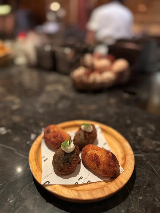 除咗黑松露Menu,亦都叫咗Regular Menu上面其中3道菜我上次冇食過嘅嚟食。分別有Ham & Squid Croquettes,紅蝦熱狗同西班牙海鮮飯。