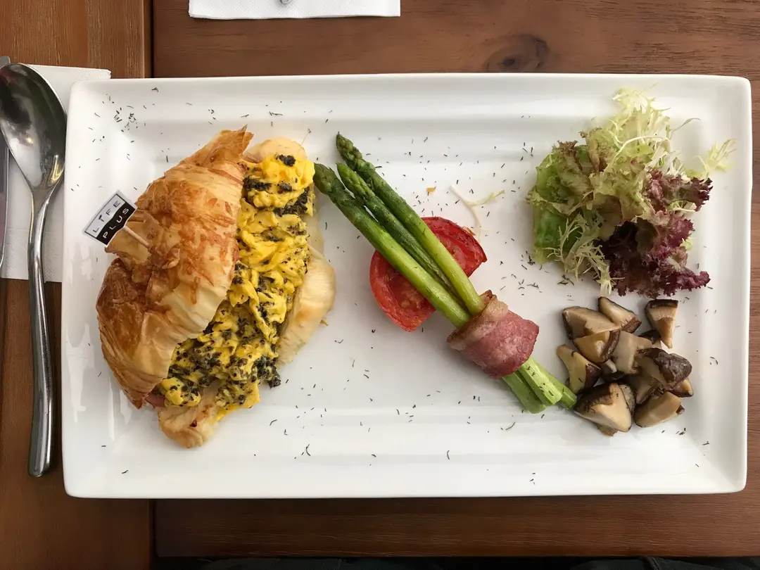 法式牛角包配黑松露炒蛋及露荀烟肉