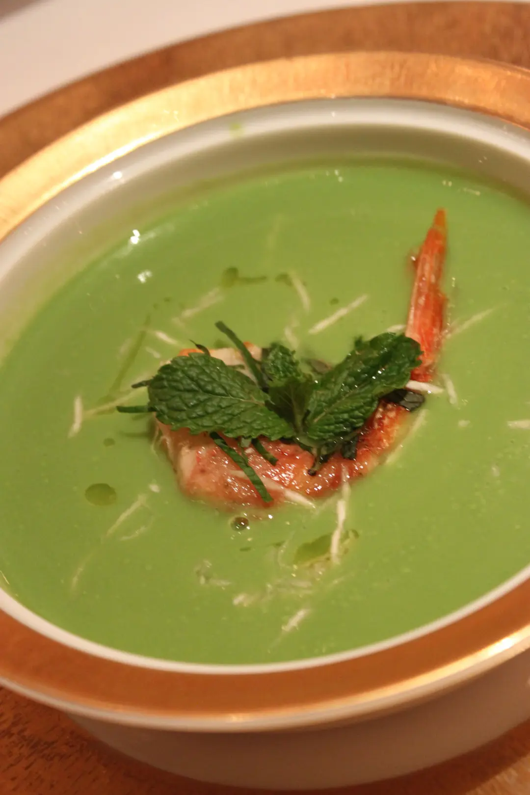 青豆蓉湯伴辣根、紅蝦及豬面頰肉