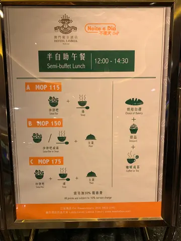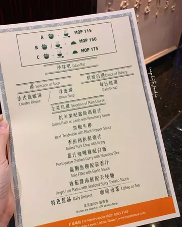 最近朋友分享 「葡京酒店 」内不夜天Cafe 中午半自助餐餐单比我睇,睇到几抵食,百几蚊左右,一共有三个选项,如下:A 沙律吧+汤: $115 +10%B 沙律吧/汤+主菜: $150 + 10%C 沙律吧+汤+主菜: $175 + 10%.上官网睇主菜发现每星期更新,每个餐会跟餐前自选面包、饭后甜品和饮品一杯(有两杯特饮 / 咖啡 / 柠茶 / 奶茶 等选择),当日天气又冻冻地,拣左C餐去试下。.半自助午餐 C餐 ($175/位*).点菜选择主菜 「扒羊架配露斯玛莉汁」 和 「香煎猪扒配烧汁」 ,汤品两个都系 「法式龙虾汤」,饮品系其中一杯特饮「柑橘柠檬梳打」和热拿铁。.首先服务员拎住是日烘焙盘过来上餐前面包,个日有甜面包和酸种面包提供,两个都拣左前者,和一般甜餐包味道差不多。.可以随时出去自助沙律🥗吧拎野食,所有种类见图,沙律大约有二十款左右,以蔬菜生果为主。另外有烟三文鱼、冻牛肉、火腿等六款冻盘任食。.自助吧对我最吸引系烧菠萝🍍、杂果沙律、牛油果🥑、烟三文鱼等,未食到主菜已经饱饱地🤣。.龙虾汤 浓稠重味道,食完暖番个身。.主菜#扒羊架配露斯玛莉汁 (七成熟)羊架嫩身,酱汁搭配刚好,意外的还不错👌🏻。另一款 #香煎猪扒配烧汁 ,猪扒系易切开易咬,但块扒无咩肉味,加酱汁亦帮助不大。.饮品推荐呢杯 柑橘柠檬梳打 加入话梅,令到整杯除左酸甜以外,多左一份咸酸味,配合梳打更清新开胃,而热拿铁就不过不失啦。.饭后饱到不得了时仲有一个中式糖水 红豆沙 ,甜度适中,暖暖地还可以的。_⭐️ 需加一服务费*⭐️ 主菜餐单会更换,有兴趣可以睇官网餐单…查看更多
