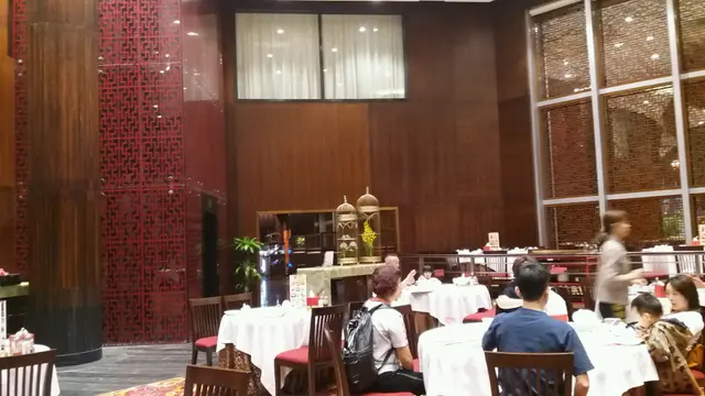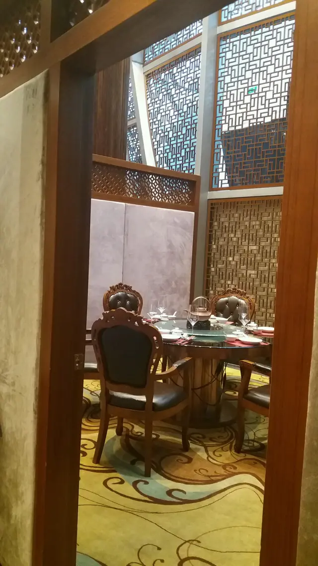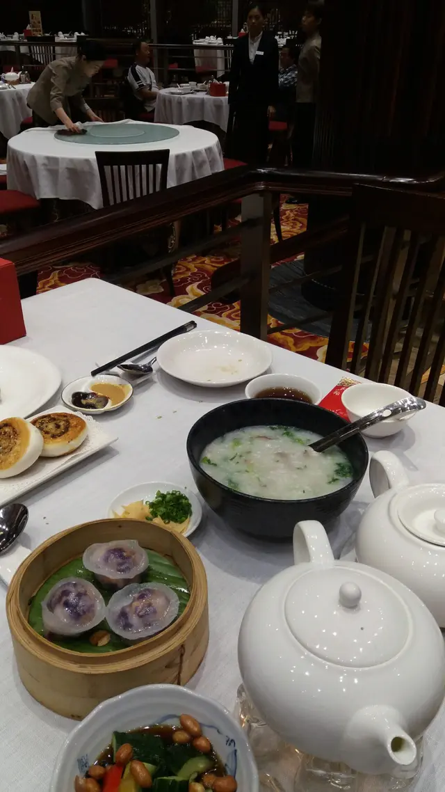 昨晚食飽飽,在翠華買個菠蘿包做早餐, 在君悦房度慢慢嘆,不用落樓,有咖啡有茶, 睇電視或望住mgm、機場景,正,波蘿包就一般。斯斯然十一點半check out,行去摩珀斯酒店, 觀摩那點豪氣, 經過此處, 裝潢有中國特色設計,高樓底有氣派, 價錢適中, 食物多元化, 鮑參翅肚, 粥粉麵飯, 潮州滷味, 川滬小菜 ,廣東點心, 目不暇給, 如大食多心嘅你一定滿足!前菜,青瓜爽甜,介菜略咸,加甜醋汁,並不是浸泡。炸兩腸粉$42,炸兩外脆但內心係鬆軟綿綿粉,腸粉皮薄,本人較喜歡内脆,會較香口,如多些腸粉皮,口感才有層次突出。金腿蔥油餅$38