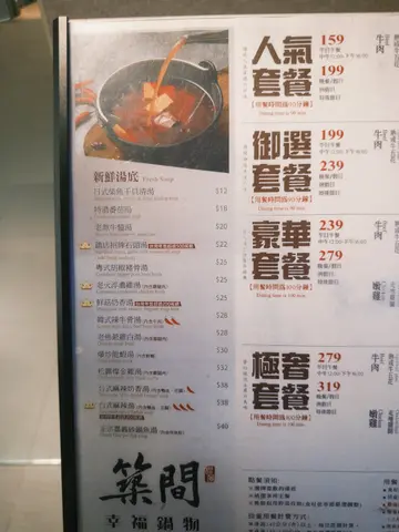 最近同朋友去咗筑间幸福锅物试下佢哋嘅极奢放题,一人$319, 价钱都好合理最惊喜系佢哋嘅汤底,叫左个镇店招牌石头汤,另外老火淬浓鸡汤都系一绝,浓郁到入口都系阵阵鸡香味。下次会再想试吓正宗嘅砂锅鱼汤出边都会有自助bar, 感觉非常之干净企理亦都有大量嘅蔬菜同埋唔同嘅台式配料选择讲到海鲜,一定要推介海潮鲜鲈鱼同埋龙趸石斑鱼片,肉质新鲜弹牙,放落滚汤嗱一嗱就食得,鱼肉超嫩滑!海虎虾同鲜虾都系必食推介,个头大大,肉质爽甜,配埋个汤底超正!至于三文鱼片就油香十足,肥美嫩滑。各款海鲜包括沙白同鲜蚵都好新鲜,特别系个鲜蚵,鲜甜多汁,一啲腥味都冇。肉类方面,美国熟成霜降牛同澳洲黑毛和牛霜降简直系极品,肉质超嫩,油花分布均匀,一入口即溶!冷藏手切温体牛新鲜度一流,肉味香浓。伊比利黑猪梅花同松阪猪都系精选,油脂丰富,肉质软嫩多汁。最后dessert环节都唔马虎,黑糖白玉奶酪香浓滑嫩,草莓同芒果奶酪都好有水准,果香浓郁。焦糖布蕾表面焦脆,入面滑嫩,甜度啱啱好。整体食物嘅质素都好好,唔怪之得系台湾可以咁出名查看更多