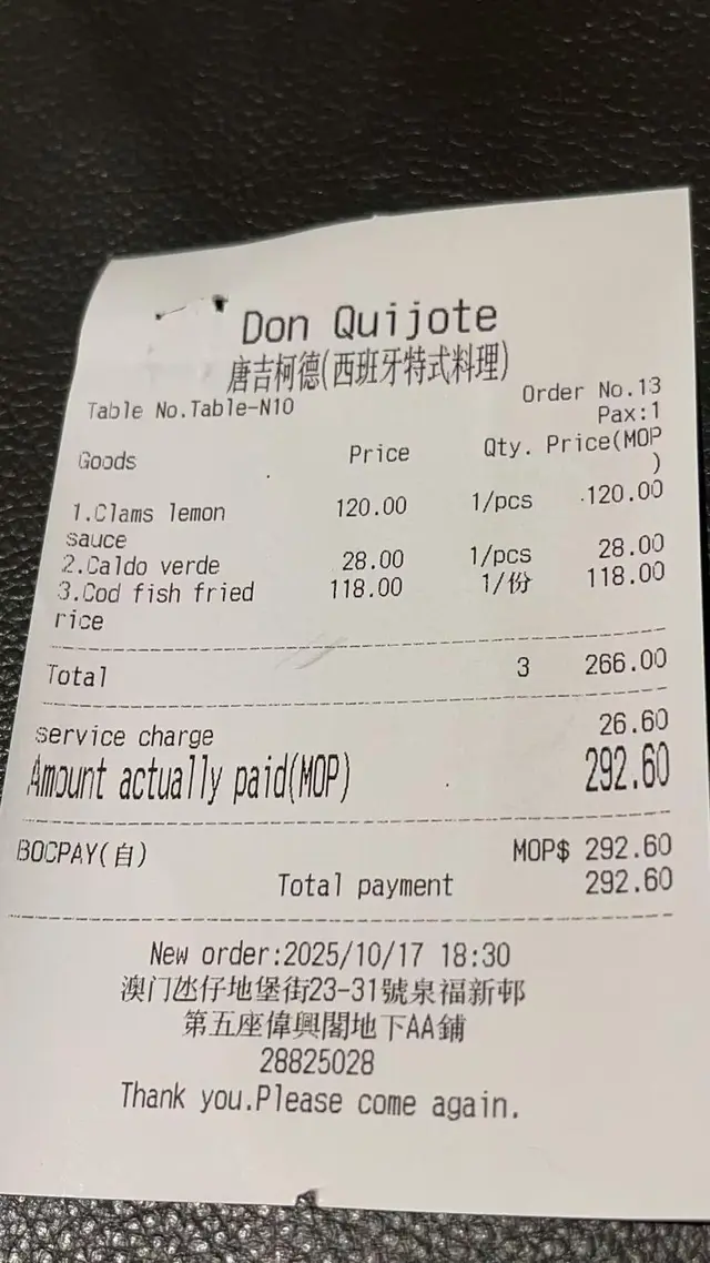 同時可以食到葡國菜同西班牙菜 tingtingb-等级42025-10-27 关注 上次食唐吉柯德個時已經覺得勁好味😋因為同時可以食到葡國菜同西班牙菜所以今次黎開澳門就決定再過黎食🤤馬介休炒飯充滿葡式風味同中式既炒飯😚炒飯粒粒分明、乾爽不黏配料好多 層次豐富 鹹中帶鮮 超級好味1葡式炒蜆炒蜆粒粒都好大隻又爽口 調味調得剛剛好 淡淡既蒜香同微辣 食起黎好惹味👅鮮甜海味又唔會過鹹 醬汁濃郁唔油膩 令人食到停唔到口😆青菜湯足料既蔬菜湯😋呢個湯夠晒營養而且飲落非常清甜🫰🏻推薦指數5星星🌟以上食记乃用户个人意见 , 并不代表OpenRice之观点。赞好分享同時可以食到葡國菜同西班牙菜 唐吉柯德 https://s.openrice.com/QrLT1FlfU00检举 张贴 评分5味道5环境5服务5卫生5抵食用餐途径堂食