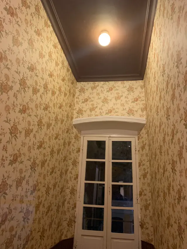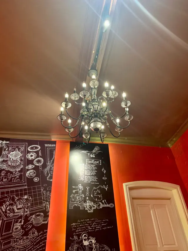 兩邊牆壁上襯托了幾幅黑底白色綫條的壁畫,天花吊燈同樣採用懷舊式蠟燭台造型;