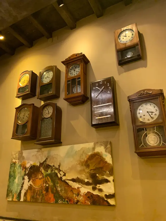 靠左邊的牆上畫掛上了八個懷舊的掛鐘🕰️ 和一幅抽象畫;