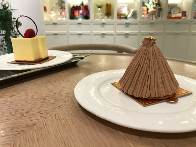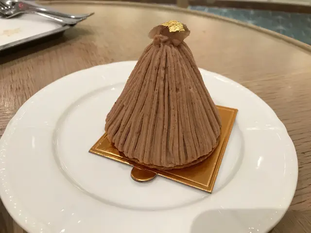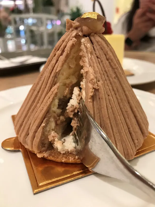 栗子蛋糕圓錐體外表,舖滿栗子蓉,頂端放一角栗子,上面貼有金箔,高貴而簡潔。