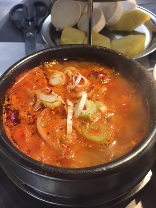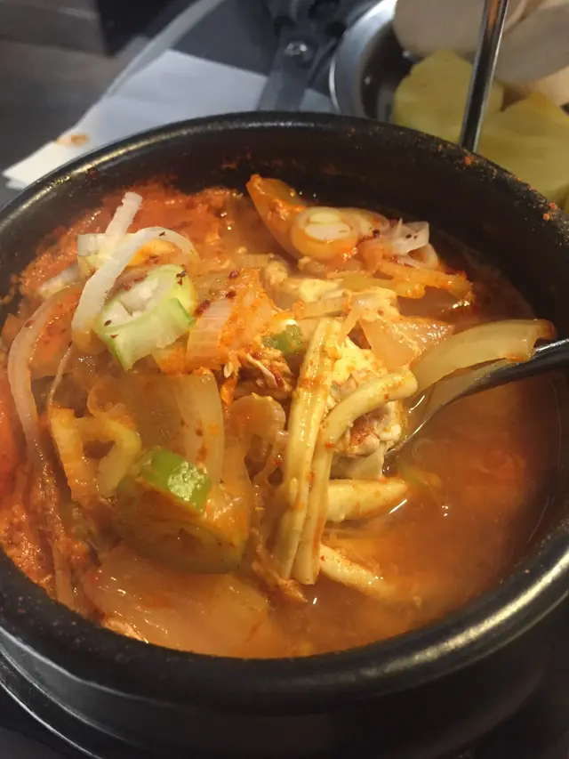 湯底味道淡如水,只有微微的辣味,泡菜的酸甜完全嘗不出。而且説好的豆腐湯,豆腐的分量只有2塊,泡菜更是少,只有一大堆大蔥和洋蔥