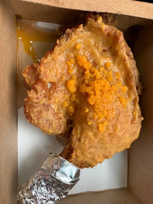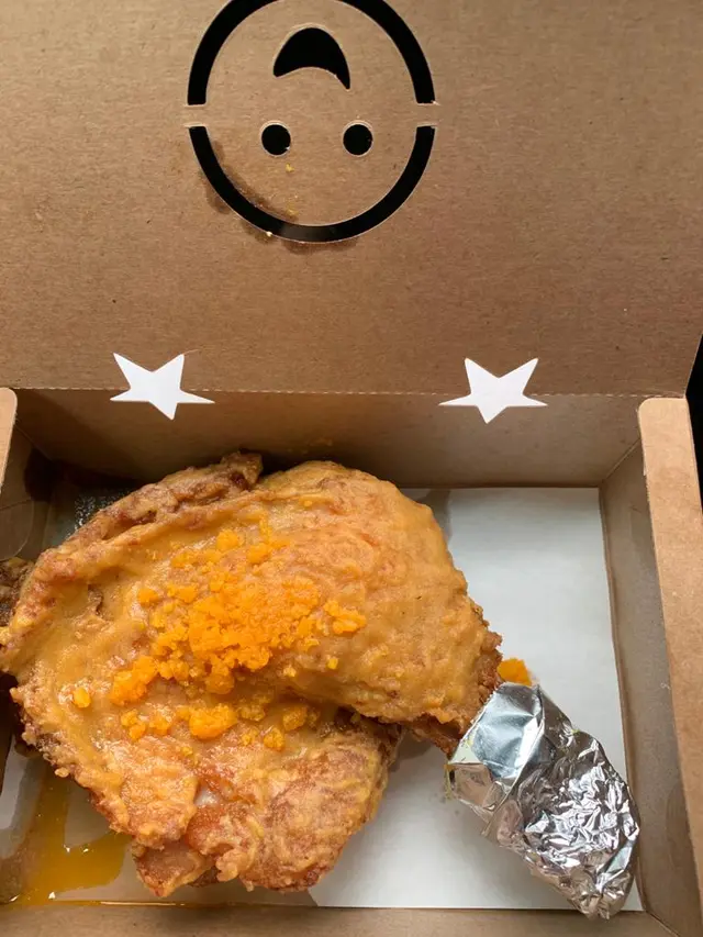難得閒日放假就決定入西貢Hea下,食完一個唔係好飽嘅lunch之後,就梗係掃下街啦。聽說呢間炸雞髀唔錯,就決定去試吓。地點一啲都唔難搵就係巴士站對住巷仔。店內只有外賣,清一色都係炸嘢。嚟到就梗係食最出名嘅黃金魔髀(有兩個size分:巨形和普通),由於啱啱食完lunch嘅關係,我哋兩個都係揀普通size(好彩,因為普通size都好大隻)。雞髀揸得好脆口,上面全部都係鹹蛋黃醬,口感好特別。而且非常多汁,十分好食。不過由於雞髀同鹹蛋黃都係好heavy。最後食唔晒,所以建議如果兩個人嘅話最好要一隻巨型原來share。…查看更多