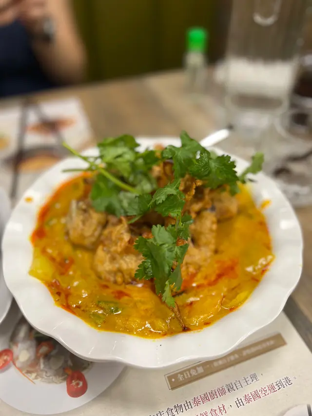 平日一至四呢間泰菜都會有支裝啤酒特價,今日我哋又黎食咗我哋最愛嘅咖喱軟殼蟹$168,今晚個咖喱汁煮得好杰身,可能落蛋多掛,令到我哋嘅蒜蓉包唔係好掛到汁,但味道依舊好好,算係性價比唔錯既一道咖喱,加埋即焗蒜蓉包條$38簡直係絕配,今晚改改口味叫咗一個馬拉盞雜菜粉絲煲,馬拉盞味就唔係特別濃,但都叫做有個煲仔上keep住個溫度,食落都還可以嘅。btw 唔明點解水喉水都要收人三蚊個(收銀妹妹話因為本店冇收加一服務費)🤷🏻‍♂️…查看更多