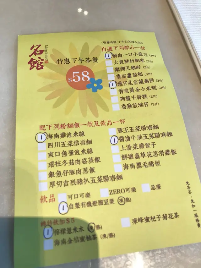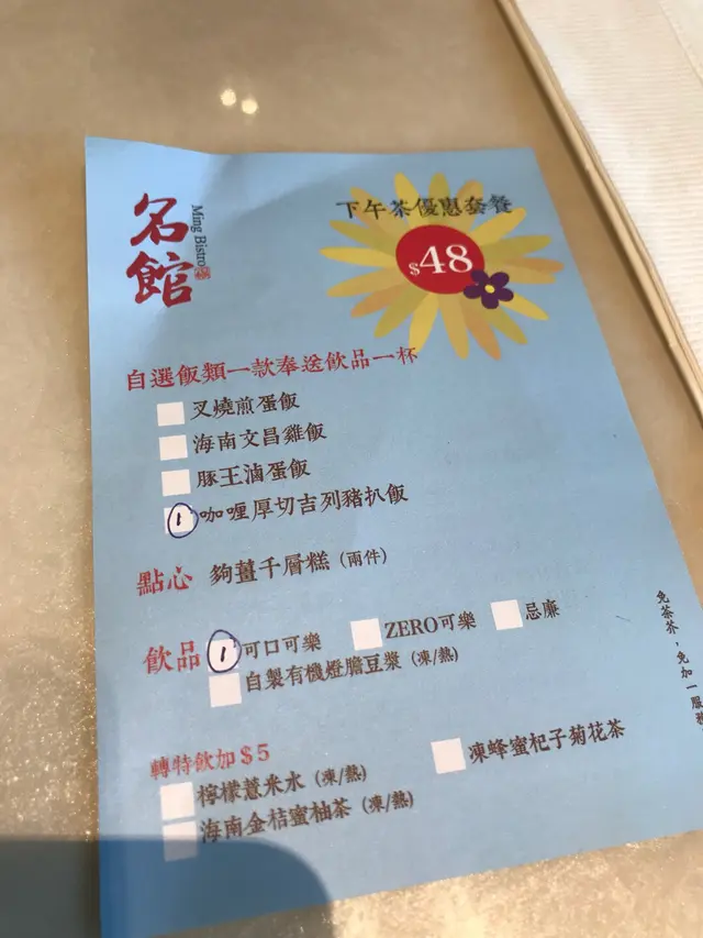 今日難得放假就同屋企人去食下午茶,之前食過名館覺得唔錯所以就同佢地去試下。去到餐廳門口冇職員帶位,企左係門口一陣先有人理我地,但望入餐廳其實係有好多職員既,但當時冇人負責睇門口...下午茶時段,有兩個下午茶餐牌侍應係會俾依張紙你自己寫既,但枱面冇筆提供,要自己另外再問佢攞筆...我地叫左......咖哩厚切吉列豬扒飯海南雞泡米線+蓮藕餅牛展陽春麵+小籠包(我劃左紙仔之後先醒起我冇影底個餐牌😅,所以張紙有我點餐既筆跡,不過咁啱得咁橋依張相好有用,睇埋落去就知點解)海南雞泡米線+蓮藕餅海南雞算幾滑唔鞋,米線份量都好足👍🏻👍🏻👍🏻👍🏻👍🏻蓮藕餅有2舊,味道都唔錯👍🏻👍🏻👍🏻👍🏻牛展陽春麵+小籠包+薑汁千層糕牛展陽春麵未影相就俾人食左啦😂但係係好食既小籠包+薑汁千層糕都係正常,好味咖哩厚切吉列豬扒飯咖哩汁夠香濃,唔會太辣,撈飯好正係度就講返個小插曲先。。。話說個牛展陽春麵係同個咖哩吉列豬扒飯一齊上菜的,當時係上左兩碗麵同一碟吉列豬扒,侍應一擺底就走左啦,我心諗明明係叫左飯架點解會變左碗麵既?!咁跟住梗係搵個Staff同佢講返啦!👧🏻: 唔該,我頭先係叫左咖哩吉列豬扒飯,唔係麵喎(我都未講完想要佢跟跟,佢就立即神回我...)👨🏻💼: 係咪你頭先劃錯左呀!!!(輕佻串咀既語氣)嘩!!!!我一聽到真係嬲左,咩態度咩回覆呀!你Check都未Check就一句得埋黎話個客錯?!佢講完依句就飄走左去Check電腦,之後默默返黎輕輕講句唔好意思就收走個吉豬麵。仲有依個Staff應該唔係普通小薯仔,應該係掃把/經理/店長之類既人物(因為佢唔係著制服架)如果果個係小薯仔,都可以話係d大粒冇教冇管,但依家連大粒都係咁既服務態度就真係唔得囉!待客之道?!總括黎講: 食物係好食既,價錢都可以接受,但服務態度絕對係差👎🏻👎🏻👎🏻👎🏻👎🏻…查看更多