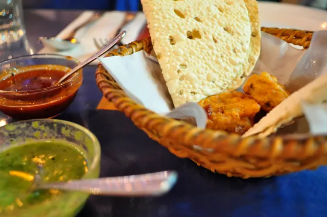 最近好想食印度菜, 本來想食CWB - 阿拉丁, 但諗起多人又5 好坐就5 想上。同朋友睇過openrice 後最想試呢間 :)一入到去已經覺得周圍環境都好靚,又少人,完全5 洗等位。d 畫仲好靚,佈置好有心機,搞到我化身遊客狂影!開頭送左個Papadum and fried potatoes. 綠色sauce 有d 辣,紅色就係酸甜! 朋友同我都覺得紅色sauce 好好食! 之後d 菜咩都加d,仲叫佢加多一碟比我地