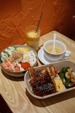 Creamy Baby🥑🍣🍚Poking可以選擇飯底或沙律菜牛油果綿密柔滑,三文魚鮮嫩多汁,豆腐清爽細膩,搭配蛋絲,醬汁同魚籽口感豐富,清新健康。蒲燒鰻魚拼雞扒便當🍱糙米飯底口感煙,鰻魚鮮嫩多汁,醬香濃郁微甜,雞扒外脆內嫩,搭配糙米飯和清爽蔬菜,口感豐富,層次分明,令人驚喜。加配了椰子蜆湯,椰子味突岀,清甜既湯加上大大粒蜆肉值得一試!蜂蜜柚子茶 芒果希臘乳酪特飲飲落去唔會太甜,芒果香甜濃郁,希臘乳酪綿密順滑,果香與奶香完美融合。…查看更多