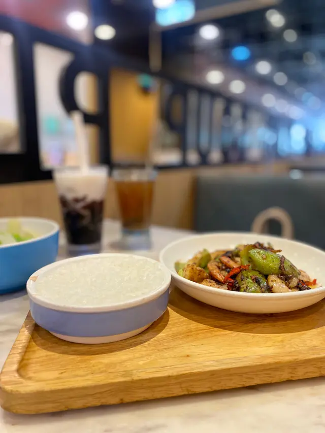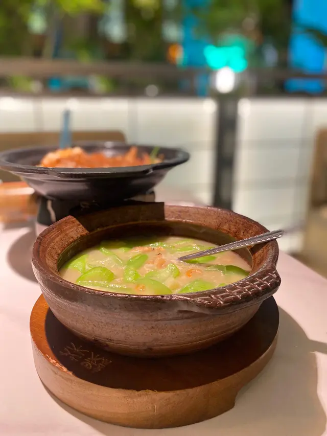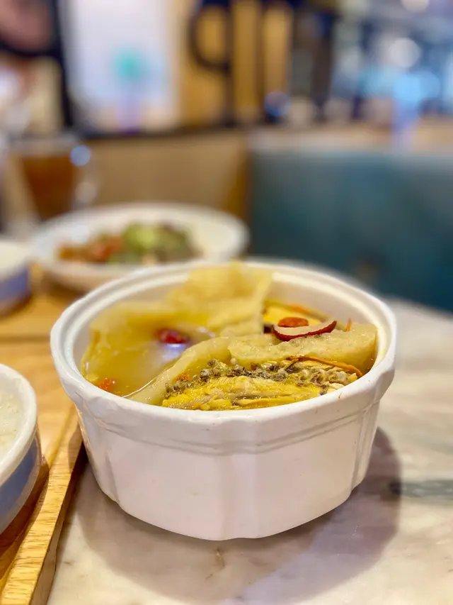 今次試咗佢哋招牌嘅燉湯二人餐,$175有齊燉湯、小菜、主菜同飲品➰燉湯二人餐 $175 ➿ 蟲草花膠魚肚雞湯蟲草花膠魚肚雞湯真係真材實料。湯底清澈、味道十足,飲落去感覺好滋補。花膠又大又厚,魚肚滑嫩,充滿豐富嘅骨膠原。➿ 豉汁勝瓜炒蝦球勝瓜爽脆清甜,蝦球彈牙,豉汁的濃烈醬香令這道菜更加出色。➿ 鹽焗雞半隻雞皮香滑,肉質鮮嫩多汁,鹽焗嘅味道恰到好處,唔會過鹹。搭配少少薑蔥油,更能夠帶出雞肉嘅鮮味。➿ 魚湯浸娃娃菜 加配$13加配價$13的魚湯浸娃娃菜真係好抵食。娃娃菜煮得冧,吸盡魚湯的鮮甜。➿餐飲兩杯仙草紅豆冰加配價$9,大大杯勁足料。而熱飲薑母茶免費加配,味道香濃暖胃。…查看更多