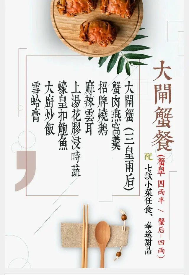 第一次嬲到寫食評,話說係HKTVMALL買咗4個大閘蟹套餐,訂7:30 4位,首先上菜已經超慢,差不多8點先有第一樣野上,個餐寫蟹是4-4.5両一隻,都預咗唔足磅,但質素差,蟹糕有苦味,蟹肉無味,招牌燒鵝得1/4隻,蟹肉燕窩羹根本無蟹肉無燕窩,花膠浸時菜,花膠變咗魚肚,蠔皇扣鮑魚超細隻,大廚炒飯已經算正常,麻辣雲耳及雪蛤膏都無上過, 所謂的任食小菜,我地只追加過一次鮑魚仔之外,未到9點已經話廚師收咗工,乜都無啦,只有炒飯可追加,9:15時未食飽就已經要埋單,我返到屋企仲要食野,仲要whatsapp反應情況但已讀不回,永遠無下次…查看更多
