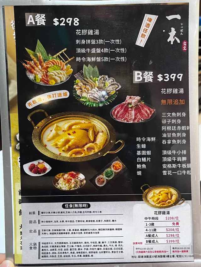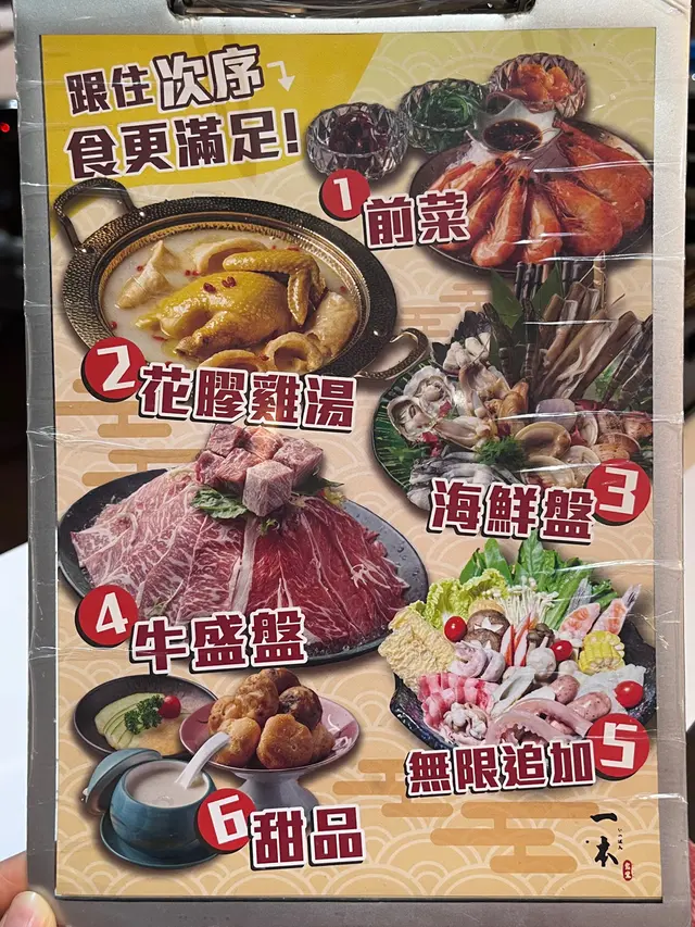 叫咗一個花膠雞湯嘅任食套餐$289呢一個湯底真係冇得彈,當住你面煮花膠同埋雞件。花膠油差唔多一個手掌咁長,而且有四條添。雞件方面佢俾咗雞髀部位,所以食落去完全唔會柴,好滑。煮出嚟嘅湯底骨膠原滿滿,飲完一啖之後嘴唇上便會黐立立咁樣。套餐包埋三款刺身,包括帶子、三文魚、大蝦。三款都非常新鮮,同埋好鮮甜。又飲到花膠雞湯又食到新鮮嘅刺身,不特止,仲食到頂級牛盛般。呢邊有四款牛:頂級牛小排、頂級牛肩胛、安格斯牛板腱同埋雪花一口和牛粒。四款都非常吸引,特別係頂級牛小排,佢嘅油脂非常豐腴,而且口感柔嫩。因為佢喺牛肋骨嘅位置附近,所以食落去油花非常均勻。之後套餐裏面仲有頂級海鮮拼盤五款,裏面有生蠔、基圍蝦、白鱔片、鮑魚同埋蜆。返學非常肥美而且滑溜絲滑,吞咗落去之後仲有貝殼類獨有嘅鮮甜。基圍蝦蝦肉彈牙,鮮甜濃郁,非常之有蝦味。令到本身濃雞湯同埋膠質重嘅湯底再加一陣鮮甜。套餐裏面除咗固定會有嘅拼盤之外,出邊任拎嘅食物都非常豐富,無論係打邊爐材料、蔬菜、甜品、熱食、炸物類。通常都有齊。…查看更多