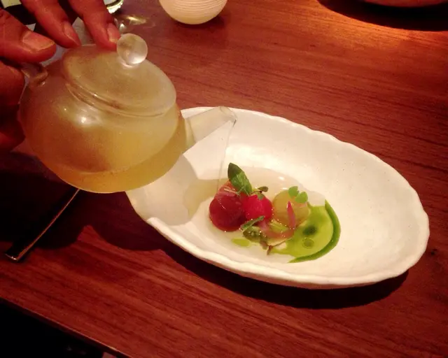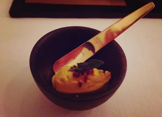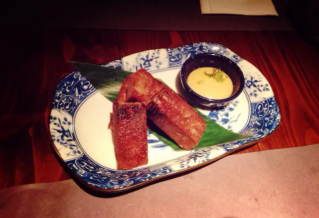 Wow ! Very eye - catching right ? We can see the chef add a big portion of fish roe right away in front of us . He is unexpectedly generous ! The chef indicates that this can add a extra succulency to the sushi . Every bites of fish roe are very fruitful and juicy, its add on some appetizingly briny notes to the sushi !!! I was fully satisfied! Monkfish Liver 安康魚肝
