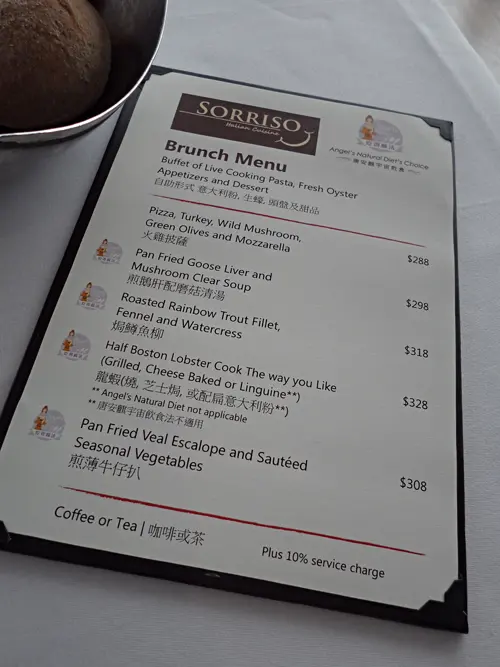 要吃Brunch當然要提早幾天訂位囉~ 星期4訂星期6的Saturday Brunch應該沒問題吧 時間是由12:00到15:30,last order是2:30呢..當天我13:00才到而且訂位時忘記說明要窗口位( 天那!這麼重要的事也會忘記嗎 !!?那維港景怎麼辦??)入到去發現有一半枱都是空的,而且仲有2張窗口位吾理咁多問左服務生可不可以坐窗口位回應是:對不起那張枱已有客人訂了!有點點失望,可是沒有法子啦 忘記要求的是自己啊!坐下來後服務生送上當天Menu意大利粉,生蠔,頭盤,甜品都是任食的!而主菜有以上4款!我點的是鵝肝和芝士焗龍蝦.點菜後當然先拿頭盤啦!說實話是有點失望的..生蠔不新鮮,放入口後忍不住要吐出來 (失禮死 )三文魚,巴馬火腿,芝士拼盤都還可以,但是沙律就不太新鮮菜不夠綠不夠甜 到底有咩可以食呢..........試下即叫即煮的意粉吧? 配料可以自己發揮,醬汁有兩款選擇哦我在配料前看了又看..負責煮意粉的廚師也沒任何反應啊! 真不夠專業 最後要了一個茄汁海鮮意粉和火腿青口白汁通粉,味道是可以的!可是廚師和服務生的態度就不合格了.. 在客人面前小聲說話大聲笑,該不會說我們有選擇困難症吧吃過頭盤和意粉就上主菜了. 鵝肝有點不夠熱, 芝士焗龍蝦又有點不夠芝士..到底是我期望太高,還是我太挑剔.. 沒有一樣東西滿意的到最後我最愛的甜品啦! 之前吃過半島的brunch一直對半島的甜品念念不忘,有又大又甜的士多啤梨啦,吃完再想吃的拿破偏,不同口味的馬卡龍,雪巴.....( 夢該醒了! 畢竟這裡不是半島嘛....)在這裡好吃的就只有香蕉批... 曲奇餅底真是做得不錯!吃下香蕉味道也很濃,再加上一點忌廉和白朱古力..好吃可是拿破偏又令我徹底失望啦..餅層不是脆的,有放得太久的感覺,而中間吉士也沒有香味..芒果芝士餅和芒果布甸的味道很像,因為芒果芝士餅是沒有芝士味的,而且太甜...馬卡龍好看就好看,有粉紅色,綠色,黃色..可是味道都一樣的!沒差其他甜品也不值一提吧..( 身為甜品控的我是每款也有吃到)坐到3點就走了,埋單一位約$330 ( 加多幾十蚊可以吃到半島 )對於Sorriso食物和服務都沒有留戀的我不會再來了…查看更多