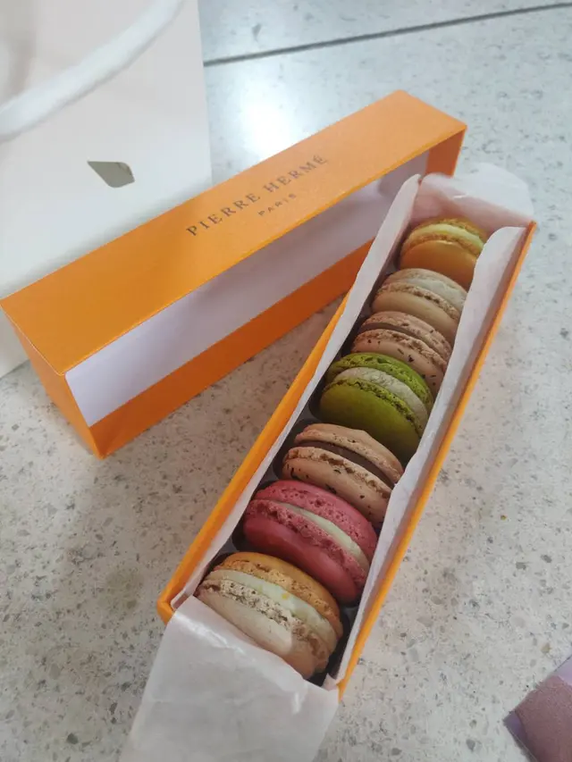 試過paul lafayet的馬卡龍,覺得廿蚊粒已經唔錯幾好食,但又忍唔住想試下d更加好食既馬卡龍對比下,所以終於去左pierre herme食番半打。最少買7件一盒裝,揀左幾隻味:-最好食既係玫瑰荔板紅莓味,估唔到除左荔板味餡料,入面仲可以包d紅莓醬!好犀利!又好食!-馬達加斯加雲呢拿,非常甜,連我係macaron控都覺得太甜- 朱古力伯爵茶,伯爵茶味佔3,朱古力甜味佔7,如果有全件百爵茶味就好啦-香橙茉莉花,橙味個邊食落有d苦苦澀澀,原來有橙肉/橙皮係入面試一次可以,但要我再食可能唔會揀呢間,畢竟性價比唔太高;同埋冇得散件買,焗住要食好多 ,太肥啦。…查看更多
