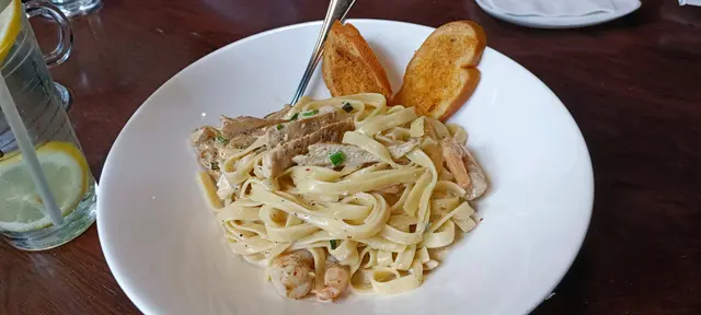 Outback steakhouse餐廳的環境寬闊舒服暗暗的燈光有點浪漫情調呢!黑糖麥包水準依然高配上忌廉芝士十分幼滑包質感十分軟滑美味今次和朋友點了兩款意粉食呢!雞肉燒蝦闊條麵蝦和雞肉份量算多而且蝦很新鮮雞肉肉質正常芝士蕃茄焗青口意粉濃濃芝士增加口感雙重享受總體:份量算大很飽肚!店員服務亦不錯!…查看更多