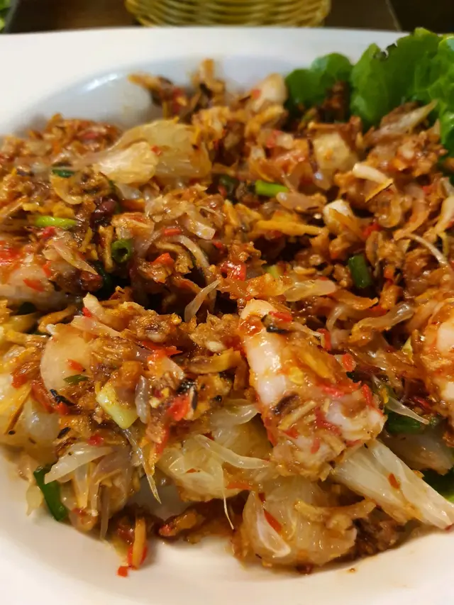 ,蝦起碼4至5隻,然後柚子同炸蒜撈混,只有一片生菜放底,冬蔭功海鮮湯,酸辣度一流,我女朋友唔食得大辣都飲到2碗