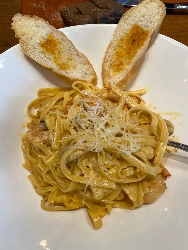 而個芝士白汁大蝦意粉真係好出色,賣相已經好靚,個面頭仲要有芝士醉,食落勁重芝士味,仲有蒜蓉包做配菜