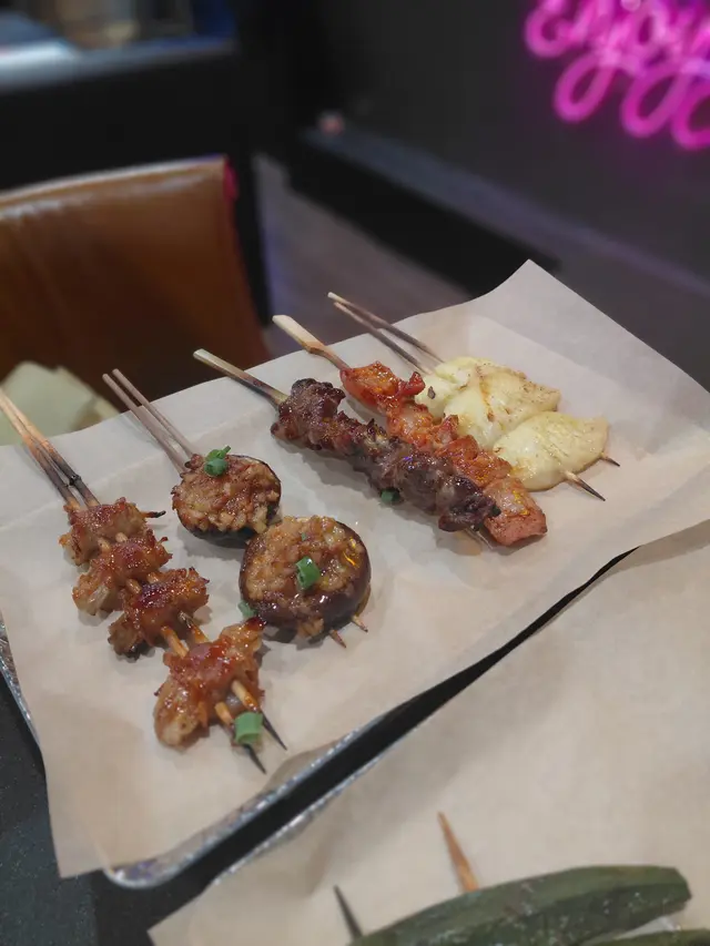 串燒live house | BliBarla 🍢🍢10蚊起一串😋 又幾好食 焗蒜蓉粉絲娃娃菜首先上桌的是焗蒜蓉粉絲娃娃菜,粉絲吸收了蒜蓉的濃郁香氣,每一口都讓人感受到蒜香四溢的滋味,而娃娃菜的清脆口感則恰好平衡了油膩,令人心情愉快。汁燒金菇五花肉捲隨後,汁燒金菇五花肉捲登場。五花肉的肥美與金菇的鮮嫩結合,入口即化,再加上特製醬汁的提味. !!jeng燒汁秋葵秋葵的清甜加上一點燒汁的鹹香,口感滑溜.鹽燒牛舌肉質鮮嫩多汁,表面微微的鹽味竟然提升了牛舌的自然風味,令人感到令人陶醉。質燒牛肋肉牛肋肉的部位選擇也很用心,燒至完美的焦香,搭配秘製醬汁,肉質軟嫩,切下一片,便能感受到肉汁的四溢冷撈汁珍寶生蠔 (熟) (好大隻 )😍🦪 大推再來是冷撈汁珍寶生蠔,這道菜特別的是一口價的優惠!雖然是熟食,但生蠔的鮮甜依然保留~泰式燒豬頸肉與鹽燒雞膝軟骨肉質鮮嫩且充滿異國風味,而鹽燒雞膝軟骨則是不同尋常的選擇,軟滑的口感讓我驚覺自己愛上了。 唐揚魷魚鬚外脆內嫩,吃起來十分過癮。配上醬料mayo,讓這道小食充滿驚喜。再來的甜品蜜糖燒菠蘿,充滿了菠蘿的香甜,熱蜜糖的焦香與冰淇淋的涼爽交融,成為完美的結尾!最後,我飲了鴨屎香檸檬茶,清新的味道使我每一口都心情愉悅!🍍🍐…查看更多