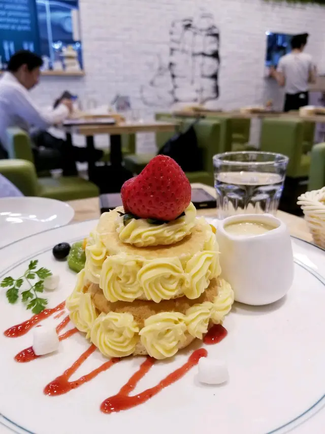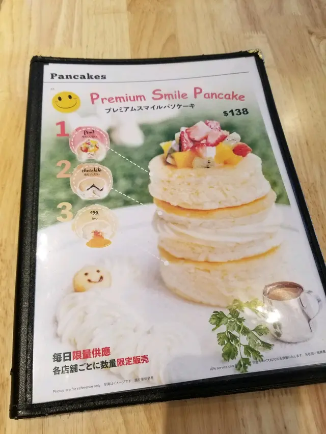 今日番工勁忙,冇時間食lunch, 最後要tea time 先有飯食經過見到呢間鋪裝修唔錯,就入左去試下本來想叫咸點食,但店員介紹有兩款新出pancake, 忍唔住就叫左黎試夏之戀人菠蘿pancake出面應該係吉士味既cream, 食落唔會好漏。下層有勁多鳳梨蓉,好似鳳梨酥,軟棉棉咁。旁邊仲有勁多生果,成件事即刻健康左(自我感覺良好中。。。)Smile Pancake3層都有唔同口味,頂層係水果,中層夾朱古力片,底層有流心蛋店員服務好好,好nice咁同我地介紹應該點樣食最鍾意係底層個流心蛋,本來仲諗住會好dry,但佢入面mix左特制醬汁,有驚喜呀總結黎講,兩款pancake都幾好味,不過份量都幾大,最好3個女仔share,咁就唔會飽得滯佢個和牛pancake睇落都好吸引,下次會番去再試…查看更多