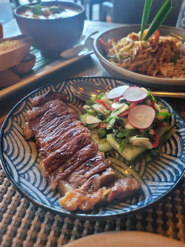 年初二想出街chill下,諗起呢間海旁既餐廳既南瓜布丁,就約埋朋友一齊黎。可能我地早到,冇咩人,唔駛等位就直接坐低。泰式牛肉沙律牛扒是煎到5成熟剛剛好,配埋旁邊酸辣既青瓜沙律啱啱好可以解膩黃咖喱蟹配蒜蓉包最鍾意有蛋既黃咖喱,配蒜蓉包超好味。黃咖哩咸淡適中,就咁食都唔會太咸,贊Pad Thai味道賣相都很好,可惜d面好硬,唔啱我口味,sad左服務同水準都同以前一樣,得閒會再番去幫襯😄可惜佢地已經冇賣南瓜布丁,希望將來有機會再食番啦…查看更多