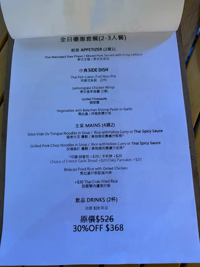近來在社交平台看到有朋友來過觀塘這間營足四季吃晚餐,覺得以露營風格來包裝泰國菜很特別,所以特地今晚相約好友到來吃一次。看到餐牌提供全日優惠套餐7折,款式多多,一於試下。泰式生菜包半肥瘦恰到好處的豬肉粒,嫩滑多汁,辣度適中,配以新鮮翠綠生菜,夾住一起吃,層次更豐富。炸泰式魚餅口感爽滑彈牙,炸得不會太油膩。泰式香茅雞翼雞翼外皮香脆仍能保留內裡豐富肉汁,獨特香茅味道令人一吃愛上。燒菠蘿菠蘿的水分被燒至蒸發,令甜味濃度急劇提昇。炭燒豬扒 泰婆汁 手抓餅豬扒用炭火慢慢燒烤,整塊豬扒都充滿著微燻的炭香味,肉質嫩滑,撒上翠綠香蔥,配以惹味的泰婆汁,以及酥脆的手抓餅,味道和口感都平衡得到。勁量蟹肉蘆筍炒飯炒飯很乾身,炒至粒粒分明,撒上大量鮮甜蟹肉,再加上惹味的炸蒜粒,建議一定要點來吃。泰式奶茶跟一般的港式奶茶不同,泰式奶茶的茶味及奶味很獨特,味道很突出,奶茶控必試!…查看更多