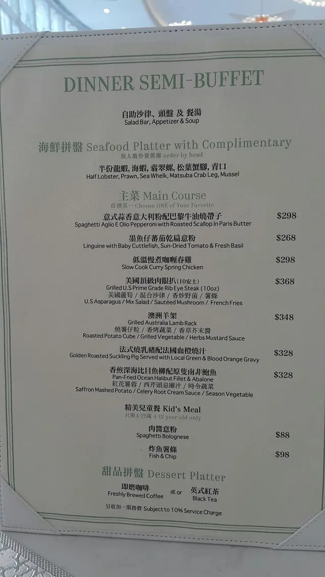 星期五晚當然要食好D,加上各大店舖都做緊清貨大減價,真係要食得好之餘,都要揀緊時間去血拼先得,所以今晚我就揀咗去尖沙咀食飯,同老公講完後,佢就訂咗呢間餐廳這間餐廳我地之前都食過,一家人都覺得唔錯,環境氣氛一流外,更係好乾淨,最適合有點點潔癖既阿囡同我,今晚到來,發覺餐牌轉咗,細看下主要都係主菜唔同晒,前菜都是跟之前差不多,但都是很合我口味!呢個2人份的海鮮拼盤仍舊好OK!大大隻龍蝦、長腳蟹、青口同海蝦全都好新鮮,食落又鮮甜彈牙,作為前菜黎講真係100分,食完個胃開晒~作為肉食主義的老公大人就當然揀咗佢最愛既牛扒!呢件扒份量十足又厚身!肉質濃香,牛香十足,加上大廚煎得很好,完全去將當中既肉汁封鎖在內,食落質感仍是很嫩滑,而配菜的炸薯條更是新鮮即炸熱辣辣,很是脆口,沾上酸度剛好的茄汁食,更是好味到不得了!我就較喜歡海鮮,所以食完海鮮盤都仍未夠喉!哈哈~這個鱸魚柳拼蟶子皇伴車厘茄黑水欖羅勒魚湯就係我心水,所以一睇餐牌揀主菜時已經揀好,蟶子皇真係幾大隻,又好鮮味,另鱸魚柳亦煎得剛好,上枱一會兒仍保留到外脆內嫩,而且咬落仲好有魚本身的鮮甜味道,真係煮得唔錯食吓影吓又食吓後,好快又過咗2個鐘,食得滿意又開心,之後就當然又係今夜重頭戲之血拼尖沙咀喇~~