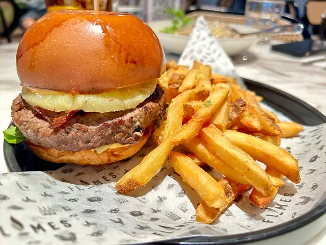 無食一排原來轉左餐牌,多左唔同款式,而且價錢仲抵左,吸引。菠蘿煙肉安格斯牛肉漢堡:食過幾次呢度嘅burger 都不錯,今次encore。賣相靚仔,份量十足,麵包表面微微烤焦,夾著厚實多汁嘅安格斯牛肉餅,牛肉餅質感紮實,肉汁豐富,濃郁牛肉香氣,熟度岩岩好。一片烤得微焦嘅菠蘿片,自然甜味帶微酸同焦香。薯條一向都高水準,即炸又香脆,外脆內軟,咸味適中。脆皮燒豬腩配蜜糖紅菜頭菠蘿沙律 :擺盆賣相討好,燒豬腩外皮金黃酥脆,脂肪分布均勻,入口時外皮酥脆,內裡鮮嫩多汁,菠蘿酸甜清新正好解油膩感,配搭不錯。卡邦尼扁意粉:醬汁有濃郁奶香味,仲有好香芝士味,口感絲滑濃稠。一向最愛,保持到水準。…查看更多