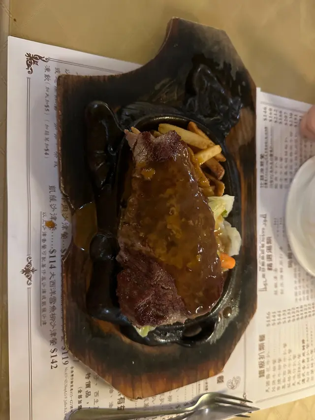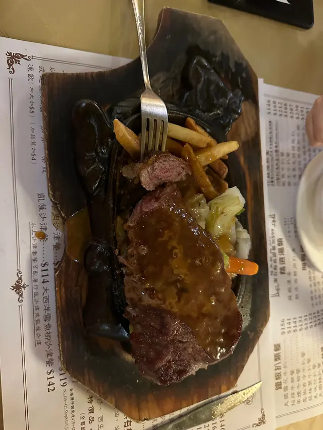 諗起鋸扒就諗到去舊金鳳,今次叫左牛柳餐及什扒餐。先黎餐飽,餐飽暖暖地,係一個櫃桶度拎出嚟,算ok啦。餐湯,白湯內D粟米蓉一堆堆怪怪地,白湯同紅湯都算ok啦。牛柳方面,冇乜味,牛柳應該有2cm厚,叫左5乘但睇落7乘,但絕對唔關鐵板事,因為牛柳底有薯條及菜隔住鐵板,D菜都唔見得燶咗,算ok啦。什扒就伏伏地,牛扒、朱扒、火鷄扒及腸仔,全部扒都無乜味,但勝在大大件(除咗火鷄扒)。最後杯飲品,杯飲品超細杯,熱飲的話一啖都冇左三分一,凍飲唔知有冇250ml,絕對絕對唔可以解渴。價錢方面都唔係平,所以性價比算中中間間。每次入去都係想食個環境,同埋易搵位。…查看更多