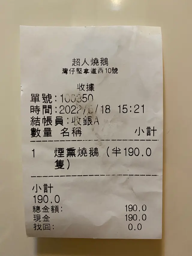 經過附近見到新開張,櫥窗啲燒鵝幾靚跟住就入咗去點知裏面仲有個燒味部counter,咁就比錢叫半隻試吓啦,點知師傅喺佢個counter攞咗半隻燒鵝嚟斬,一斬就知大件事,只見到皮同肥膏,我就問師父肥到咁點食呀,佢就一邊斬我就一邊講,到佢斬完我就講肥到咁真係食唔到喎我不如買罐鵝油食好過啦。跟住我問阿姐攞返張收據,師傅就死死氣再斬過俾我。食後感覺皮不脆,肉好鞋,冇乜味。如果以半隻$190黎講還有其他更好的選擇。…查看更多