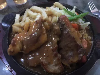 好細間,位置唔多職員叔叔比較急速酥皮鵝肝威靈頓牛扒,配飯用碟上,汁太小,酥皮幾重牛油味叫左5成,但食落似7成,食唔到有鵝肝,肉好鬆軟,飯既份量算多美式什扒用鐵扒上,雞扒,豬扒,牛扒,每樣都得半件薯條份量ok,鐵板上,但職員倒左汁先送過來微弱既滋滋聲,啲扒唔夠熱,黑椒汁亦唔夠味紅湯,比較稀白湯,有粉粒凍檸茶,幾好飲華田脆脆,唔夠濃埋氺單:202…查看更多