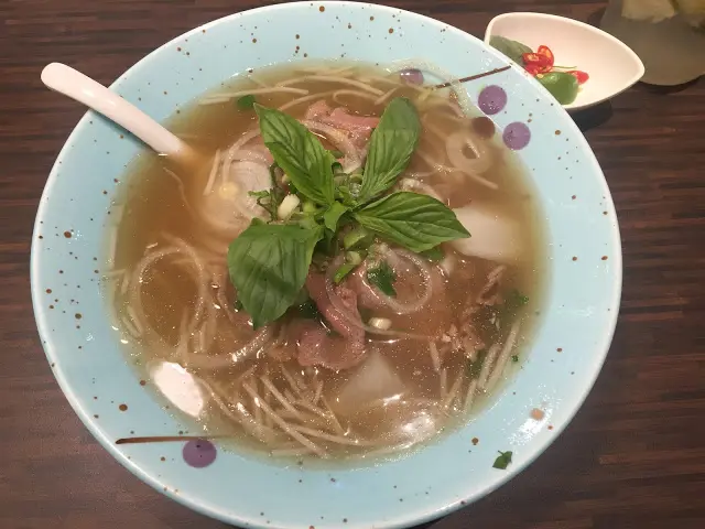 近黎因工作關係經常同米先生一齊出入九龍灣,今日就同米先生食埋晚飯先走,德福廣場既食店基本上好多都試過...今日就去到二期試下越南菜,嚐越!因為太早食左午餐,所以當晚十分肚餓叫左好多野食XD我地2人分別點左水晶鮮蝦扎肉米紙卷(HK$60)、沙爹串燒雞肉(HK$69)、越式浸嫩菜(HK$68)、鮮黃牛脊湯粉(HK$65)、香茅豬扒撈檬(HK$65)同埋青檸梳打(HK$34)當時人流唔係好多,所以食物好快就上枱喇~~首先到既係青檸梳打,同埋牛脊湯粉,湯粉配埋一小片既青檸同埋辣椒~~我個人好鐘意食越南菜既湯粉,因為多數既湯都係好香既牛湯味同埋香葉味~今次依個牛脊湯粉十分附合我既要求!!湯底十分濃郁~~而且牛肉既熟度岩岩好~唔會熟到變老牛~好食!!!之後就係米先生既豬扒撈檬~因為我只係試左塊豬扒~~不過米先生就話好食~~豬扒嫩肉唔鞋口~~而且配料都十分豐富~~唔會因為冇左湯而唔飽肚既撈檬~米紙卷入面有原隻既蝦~蝦爽口唔"梅",入面卷埋札肉同埋青瓜仲有蘿蔔絲~十分青爽~~好食~~米先生指名要點既越式浸嫩菜~~係通菜黎~~底既係類似豉油但冇豉油咁鹹既湯汁~配上通菜剛剛好~~最後就係串燒~~因為已有牛肉湯河同埋豬扒檬~所以我地係點左雞肉~雞肉串燒得剛剛好唔會太老~沙爹汁十分濃香~不過有小小似咖哩多過似沙爹~~總括黎講我食過好多間越南菜野~好多既湯粉同埋撈檬都做得十分普通..簡直亂黎=_=不過嚐越就做得十分好食~~地點方便~~CP值高~~推介各位行完街街之後就黎食啊~~~地址:九龍灣德福廣場2期4樓413 – 414號舖…查看更多