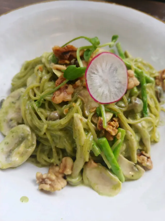 不錯 鳥語 2021-02-04咁啱中午過左海。就近搵間黃店食。以為中午時份會多人。點知都幾靜。對個人就好嘅靜靜地。但都希望可以生意好啲。lunch set叫左個pesto linguine.自家製青醬好似幾吸引。pasta我係比較中意pesto sauce。無cream sauce咁漏無tomato sauce咁驚酸。然後出到嚟原來係pesto cream sauce(扶額 笑)其實好食嘅唔算太漏。份量都夠。蘑菇合桃都足料。linguine煮得幾好。只係真係無諗住係cream因為我本身想清清地。如果我食素唔飲奶就會比較尷尬。咁當然自身都應該更加注意落單時問多句保險啲。然後加左$40柚子蜜糖雞翼。的確係唔脆嘅同埋柚子蜜落得都幾多。味道可以。哩個價錢5隻算係咁。餐飲包咖啡或茶。一般諗住寫茶即係檸水檸茶或者奶茶都應該有。我叫奶茶話無喎。咁檸水。小姐姐又好猶疑。咁我唔知我可以叫咩就問。原來係無糖綠茶。咁 不如你一早話我知其實我無咩所謂lol然後中午窗口位會越來越曬。如果係客人進入時未曬到個位但明知之後會好曬。提一句窗邊位會比較曬其實會貼心啲。又唔洗之後要調位又要上晒菜再搬嚟搬去咁。預祝新一年生意興隆。越做越好。…查看更多以上食評乃用戶個人意見 , 並不代表OpenRice之觀點。讚好分享不錯 鳥語 https://s.openrice.com/QrLT02Eux00檢舉 張貼 評分4味道5環境4服務4衛生4抵食推介美食自家製柏士圖醬意粉用餐途徑堂食用餐時段午餐