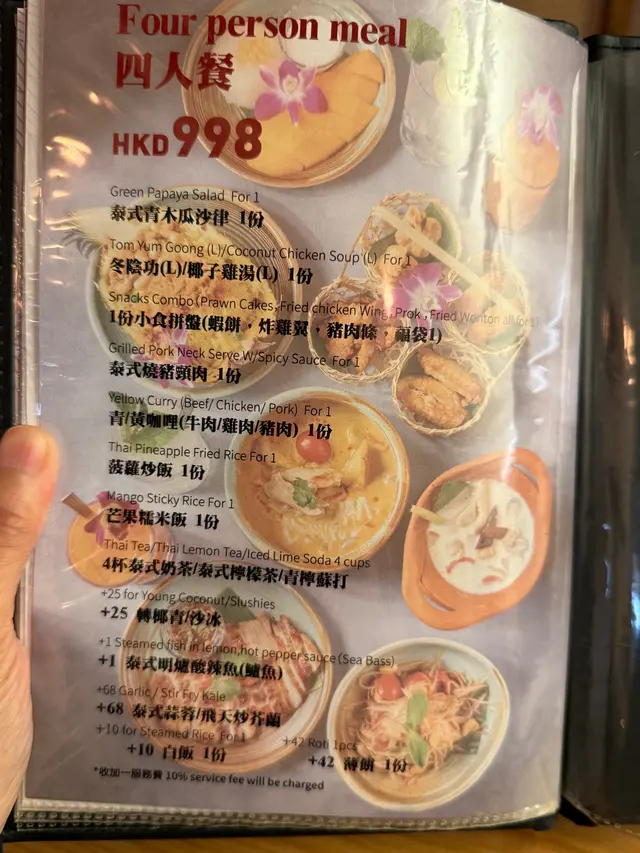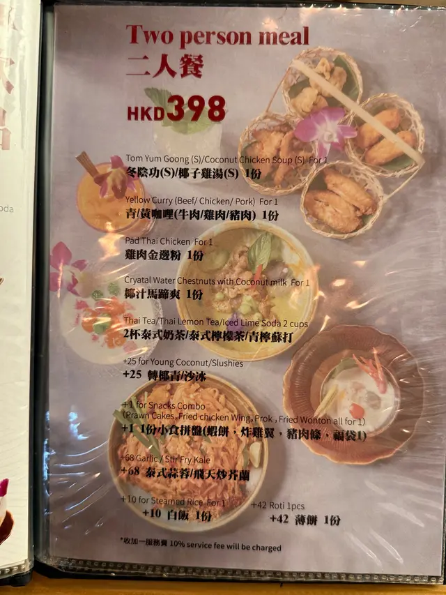 呢間泰國餐廳位於灣仔合和中心對面,地理位置十分便利另外,餐廳米芝蓮廚師主理,招牌二人餐只需$398就包以下食品,十分抵食:🌼冬蔭功(S)/ 椰子雞湯(S):冬蔭功味道酸辣味道啱啱好,可以倒滿兩個湯碗🥣🌼青/黃咖喱 牛/雞/豬肉:黃咖哩好香椰奶味,唔使擔心會好辣。惹味程度要加配薄餅蘸咖哩汁!🌼雞肉金邊粉金邊粉炒得酸酸甜甜好開胃🌼椰汁冰冰馬蹄爽一碗滿嘅香濃椰汁配冰粒加馬蹄爽,爽脆透心涼食厭咗芒果糯米飯嘅話 呢個大推!🌼兩杯泰式特飲(泰式奶茶 / 泰式檸檬茶 / 青檸梳打;可以+$25 轉椰青/沙冰)跟餐加$1 有炸物小食拼盤;包括蝦餅/雞翼/豬肉條/雲吞福袋。味道絕對唔揸流攤另外仲散叫咗個泰式燒牛肉,肉質十分嫩滑!除咗二人餐超出色,$998四人餐仲可以以$1超值價加購泰式明爐酸辣魚…查看更多