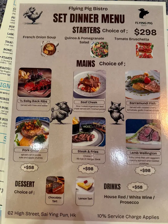 呢間餐廳紮根喺西營盤已經有十年啦!餐廳員工同啲街坊熟到經過行埋都會打聲招呼寒暄幾句餐廳設有室內室外座位,等主人可以同毛孩一齊食飯;另外,明白到用餐時間長小朋友會悶,餐廳仲會提供顏色筆俾小朋友畫下畫油顏色。喺好多細節位都感受到濃厚人情味🐷🍽️✨ 𝓢𝓮𝓽 𝓓𝓲𝓷𝓷𝓮𝓻 🐷🍽️✨ 𝔀/ 𝓢𝓽𝓪𝓻𝓽𝓮𝓻𝓼 / 𝓜𝓪𝓲𝓷 / 𝓓𝓮𝓼𝓼𝓮𝓻𝓽 · Tomato Bruschetta· French Onion Soup· Lamb Wellington· 1/2 Baby Back Ribs· Chocolate Tart / Lemon Tart前菜 /番茄意式烤法包: 多士鋪滿新鮮蕃茄粒、生洋蔥、芝士,再淋上黑醋,酸酸甜甜帶點辣味,惹味又開胃今餐重點介紹威靈頓羊柳。呢道菜唔係到到都食到(平時威靈頓牛就見得多!)表層酥皮做得好脆,餡料有羊菲力條同茄子🍆味道出奇地夾🙌羊肉質嫩滑,羊羶味唔算重。配菜有焗薯仔同菠菜薯蓉。Happy Hour時間光顧除咗可以食到特色小食拼盤,只須$36起就可以暢飲啤酒、葡萄酒、雞尾酒🍻…查看更多