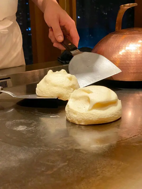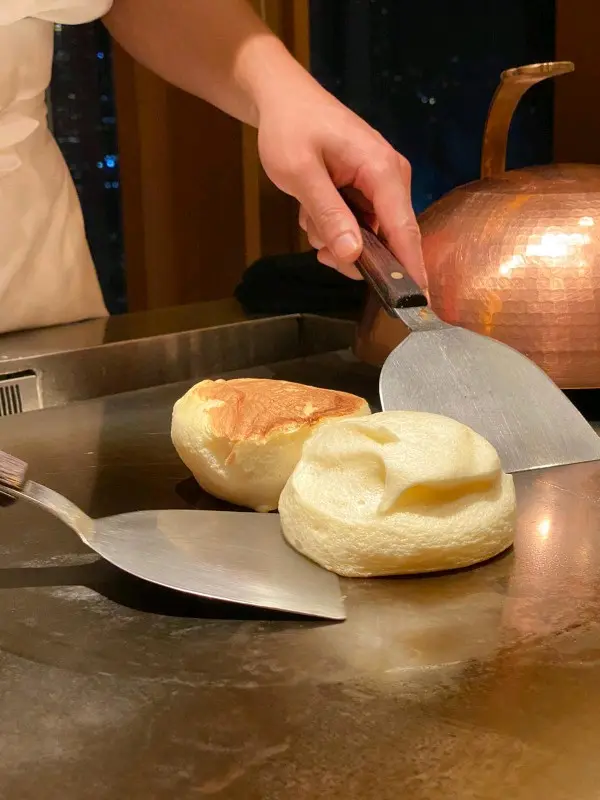 鐵板燒嚟不開嘅食材都係海鮮、鵝肝、牛肉、炒飯等,調味都係鹽、黑椒為主,味道就視乎個大廚係重口味還是適中……依間鐵板燒特別之處係甜品,一人餐嘅甜品係朱古力蛋糕(因為睇到隔離嗰pair情侶),而我哋嗰個二人餐嘅甜品就係梳乎厘,西餐廳嘅梳乎厘係喺廚房焗爐焗完即刻拎出嚟,依間就係喺廚房打好麵糊後即場喺鐵板上焗梳化厘,師傅話咁樣焗係無得睇進度,只能靠經驗,仲要小心癡底,最後出嚟嘅製成品並不是慣常挺身嗰種,依個梳乎厘雖然好快下榻,但口感不比焗爐的差,讓整餐鐵板燒帶來最尾的驚喜。