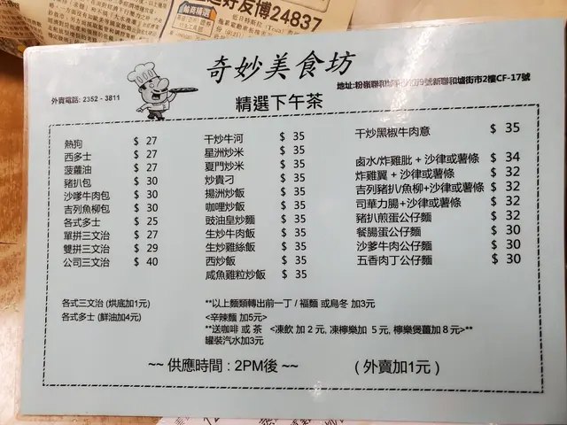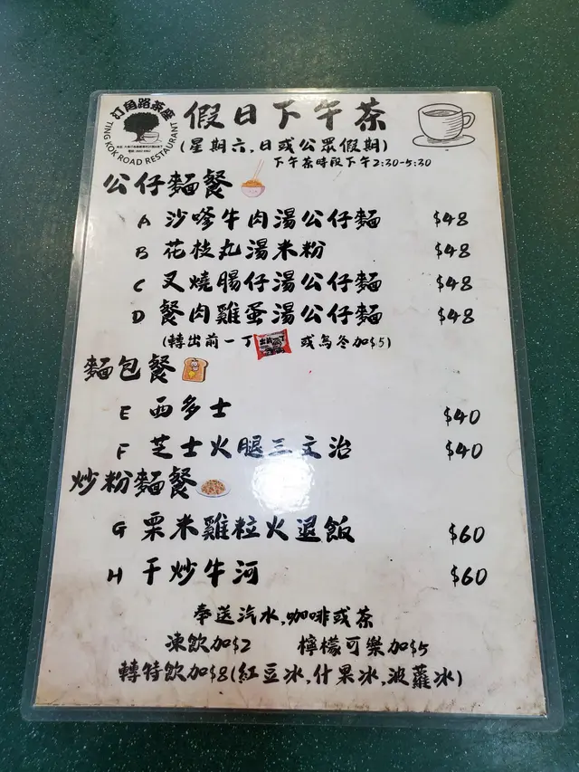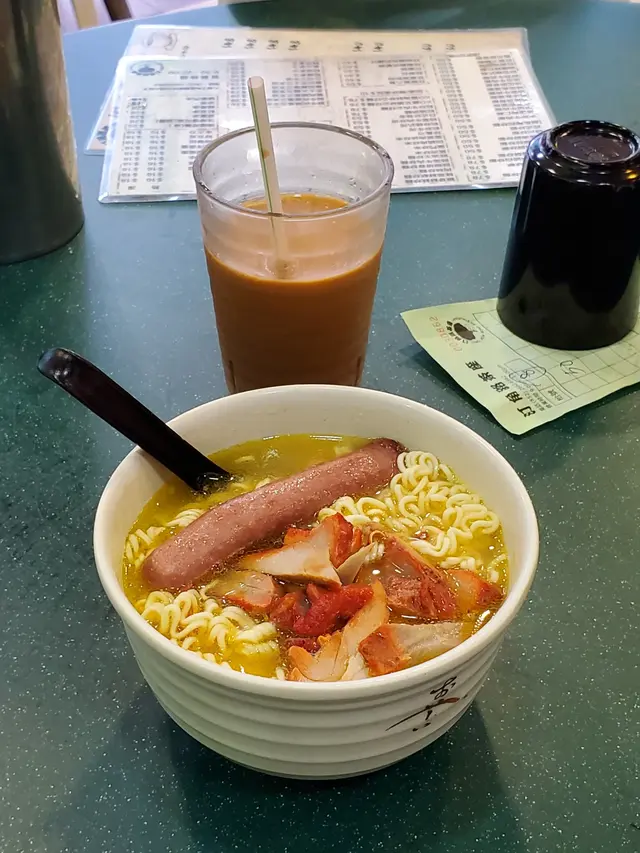 星期日食個下午茶餐,場景全日落大雨都冇乜客人。問有冇下午茶,才拎餐牌出嚟,唔問咪要食正價餐?叫咗叉燒腸仔公仔麵+冷奶茶。承惠$50。