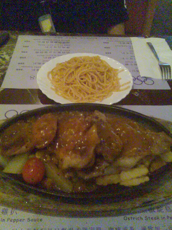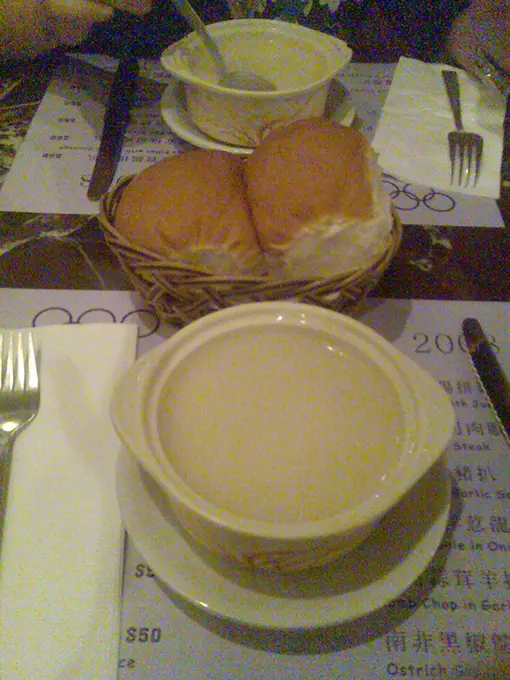 入到去人流一般, 我同朋友揀左卡位坐我地叫左個雞扒餐(伴黑椒汁), 等左十分鐘到就上碟,主菜之前來左兩個麵包仔, 好熱好新鮮, 不過個忌廉湯就比較"粉"左少少, 唔滑。之後個主菜來左, wow, 非常豐富, 黑椒汁惹味香濃, 雞扒又嫰又滑口, 好味