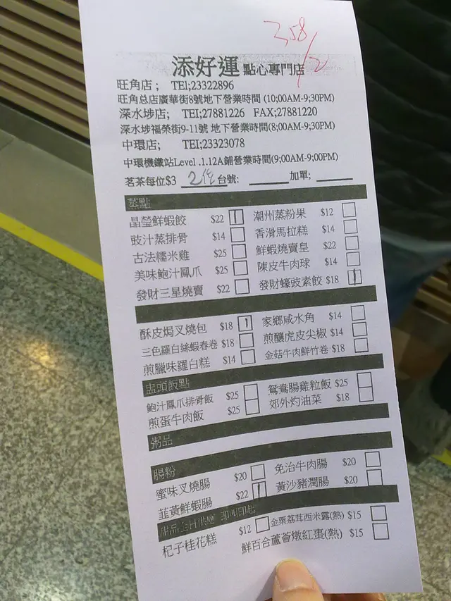 之前未去過其他添好運的分店不過聽過唔少朋友去過都有好評最近知道IFC地庫機鐵站範圍開左間分店所以去開中環就特別去試下晚市時間,等位入座時唔會派籌,反而係寫低籌號落點心紙上.等位的時間慢慢係張點心紙上選野食一入位就交單張紙俾職員入單由於一路等位一路選野食,所以等位啲時間過得好快呢間野的點心選擇比正常酒樓少好多不過主流的蝦餃燒賣,各式腸粉/盅頭飯都有,還有少量甜品可供選擇今次叫左4樣野食首先係酥皮焗叉燒包($18),味道相當不錯,啲叉燒唔會太肥,個酥皮又唔會太鬆軟,樣樣都岩岩好之後係韭黃鮮蝦腸($22),韭菜加鮮蝦,想不到會幾美味,啲腸皮薄薄的,鮮蝦大大隻跟著係晶塋鮮蝦餃($22),呢個係咁多樣裡面最好食,個皮相當煙韌,裡面D肉好札實,又有蝦味呢最後係發財蠔豉素餃($18),想不到用發財蠔豉整素餃會咁好味,而且個素餃份量十足,抵食!呢間野更免加一,只收茶錢$3一位,係中環有咁平靚正的選擇真係超讚!…查看更多