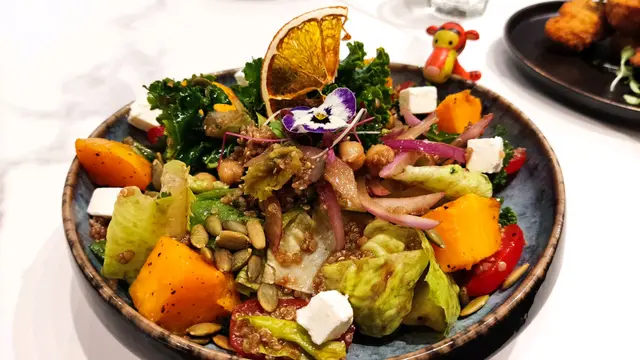 烤南瓜🎃,藜麥沙律🥗配蜜糖🍯黑醋汁 $98沙律🥗賣相一流,撈勻後仍然色彩豐富增加食慾,而味道整體配合得非常好,是一個非常不錯的主菜。朋友話這款白色的芝士連蔬菜一起咬下,感覺非常特別,而且出奇的好味,藜麥非常多,啖啖沙律均有很多藜麥在內,口感很特別。